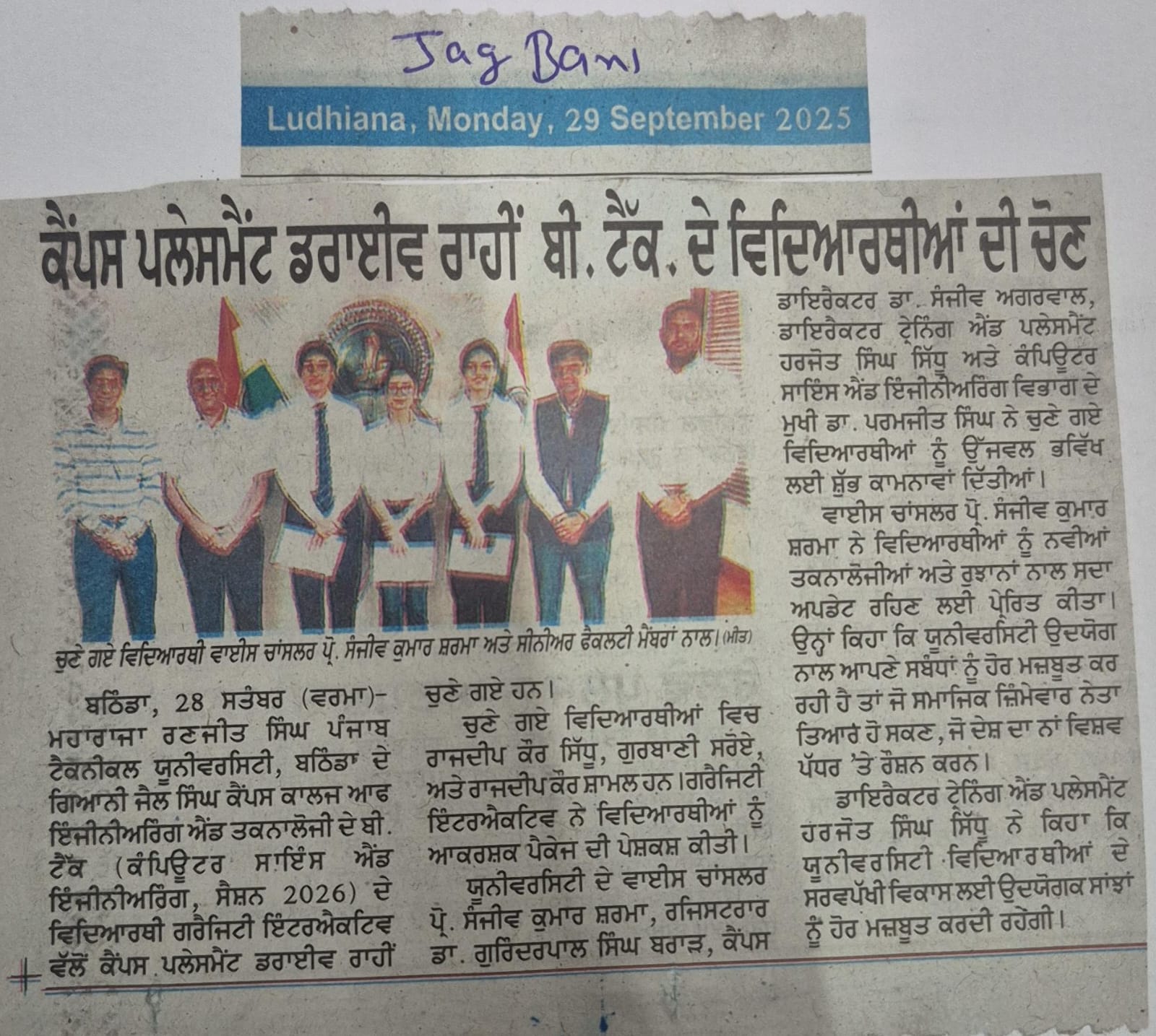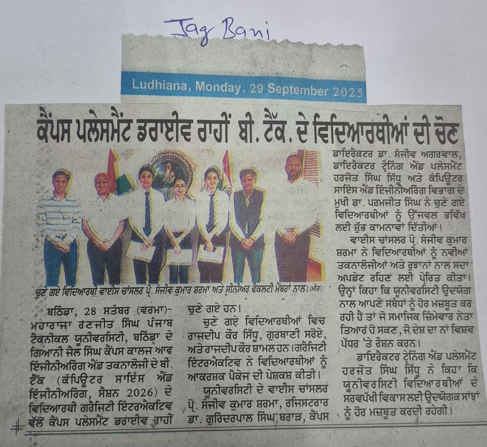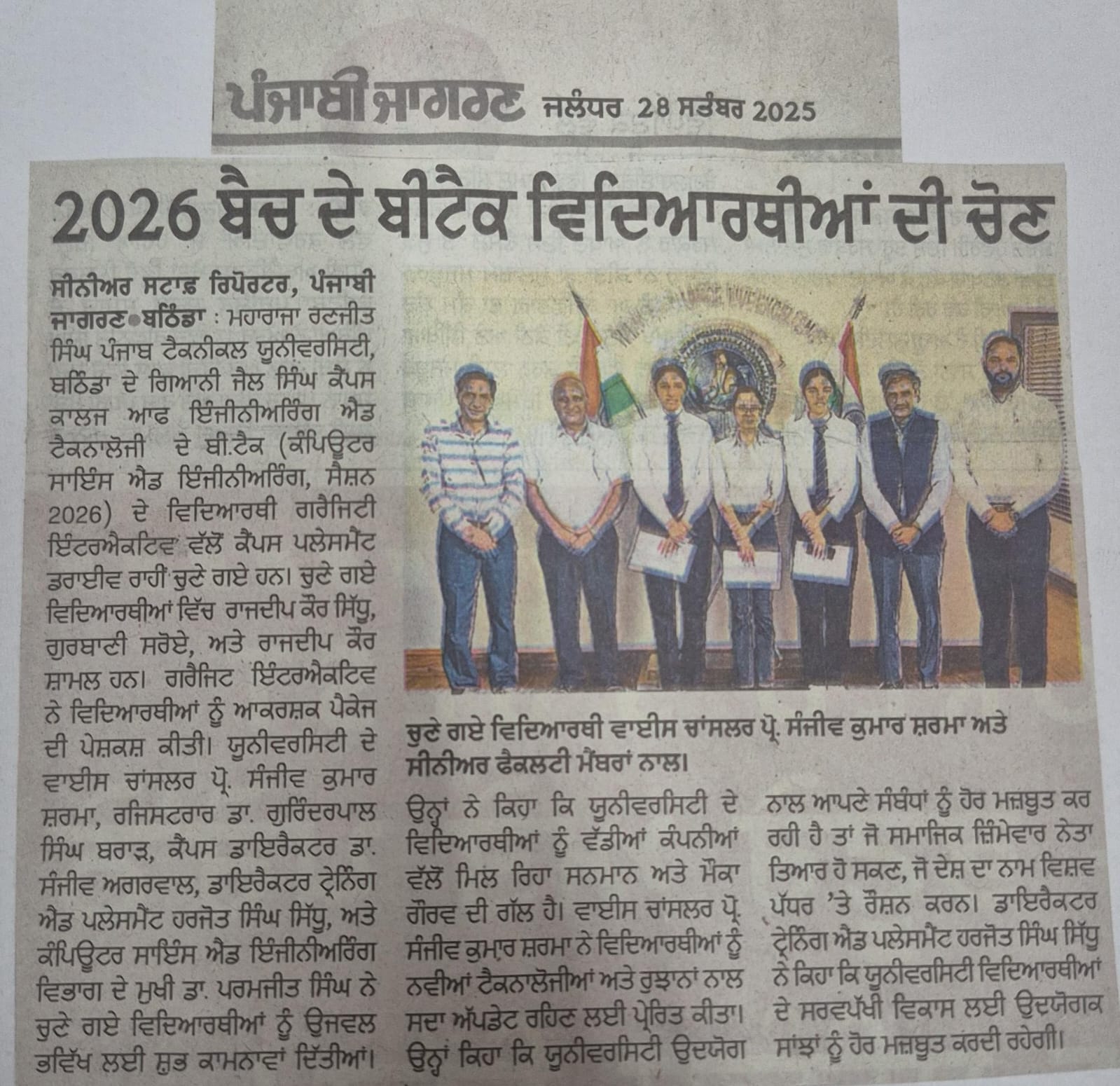 2026 Batch B.Tech students Placed through Campus Placement Drive….. Bathinda, September 25 Students of B.Tech (Computer Science & Engineering, Year of passing 2026) from Giani Zail Singh Campus College of Engineering and Technology (GZSCCET), Maharaja Ranjit Singh Punjab Technical University (MRSPTU), Bathinda, have been successfully placed in Grazitti Interactive through a campus placement drive. The selected candidates include Gurbani Saroy, Rajdeep Kaur Sidhu, and Rajdeep Kaur. Grazitti Interactive offered them an attractive placement package. MRSPTU Vice Chancellor Prof. Sanjeev Kumar Sharma, Registrar Dr. Gurinder Pal Singh Brar, Campus Director, GZSCCET Dr. Sanjeev Aggarwal, Director–Training & Placement, MRSPTU Harjot Singh Sidhu, and Head, Department of Computer Science & Engineering Dr. Paramjeet Singh, conveyed their best wishes to the selected students for a bright and successful career. They expressed delight that MRSPTU students are consistently being recognized and recruited by reputed companies. Congratulating the students, Vice Chancellor Prof. Sanjeev Kumar Sharma encouraged them to stay updated with emerging trends and technologies. He emphasized that the university is committed to strengthening its engagement with industry and nurturing socially responsible leaders who will bring pride to the nation. Director–Training & Placement Harjot Singh Sidhu also reiterated MRSPTU’s commitment to industry collaboration and holistic student development. Photo Caption: The selected students with MRSPTU Vice Chancellor Prof. Sanjeev Kumar Sharma and senior faculty members. |