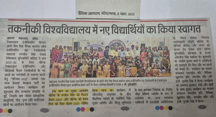 Parichay-2025": Textile Engineering Department, GZSCCET, MRSPTU Bathinda hosts Grand Fresher’s Welcome Party….. Bathinda, November 6: The Department of Textile Engineering, Giani Zail Singh Campus College of Engineering & Technology (GZSCCET), Maharaja Ranjit Singh Punjab Technical University (MRSPTU), Bathinda, organized a grand fresher’s welcome party titled “Parichay-2025” to warmly receive the new students of B.Tech. (Textile Engineering) and B.Sc. (Fashion Technology) for the session 2025–26. The event began with the lamp-lighting ceremony, symbolizing the triumph of knowledge over darkness, followed by a series of lively cultural performances—songs, dances, and fun games—that filled the auditorium with energy and excitement. The highlight of the evening was the announcement of Mr. Harpreet Singh (B.Tech.) as Mr. Fresher-2025, and Ms. Heaven Gill (B.Tech.) along with Ms. Jasmeen Kaur (B.Sc.) as Ms. Fresher-2025, amid thunderous applause from the audience. The event was graced by Prof. Palwinder Singh, Dean (Academic Affairs), GNDU Amritsar, as Chief Guest, and Dr. Nirmal Jaura, Director, Students’ Welfare, PAU Ludhiana, as Guest of Honour. Other dignitaries present included Prof. Pankaj Chhabra (HOD-Architecture & Associate Dean, GNDU Amritsar), Prof. Monisha Dhiman (Director, IQAC, CUP Bathinda), Er. Amitoj Singh (Jagat Guru Nanak Dev Punjab State Open University, Patiala), and Dr. Kuldeep Walia (Director, CIQA). Prof. Sanjeev Kumar Sharma, Vice-Chancellor, MRSPTU, presented bouquets to the guests. The function was also attended by Dr. Gurinder Pal Singh Brar (Registrar, MRSPTU), Prof. (Dr.) Sanjiv Kumar Aggarwal (Campus Director, GZSCCET), Mr. Harjinder Singh Sidhu (Director, Public Relations), and Er. Harjot Singh Sidhu (Director, Training & Placement). In their addresses, Prof. Palwinder Singh and Dr. Nirmal Jaura congratulated the freshers and encouraged them to uphold teamwork, creativity, and academic excellence. Vice-Chancellor Prof. Sanjeev Kumar Sharma lauded the department’s strong placement record and highlighted the importance of co-curricular participation in nurturing leadership, confidence, and interpersonal skills. Earlier, Prof. Reeti Pal Singh, Head, Department of Textile Engineering, welcomed the guests and shared that the department achieved 100% placement for eligible students in the past two years, with the highest package of ₹12 lakh per annum offered by Trident Group. Senior faculty members Prof. Anupam Kumar (Dean, R&D), Prof. Devanand Uttam (Chief Warden), and Dr. Parikishit Paul (Associate Professor) guided the organizing team. The event was successfully coordinated by Ms. Gagandeep Kaur, Ms. Reetika, Ms. Khushreet Kaur, Ms. Jagjit Kaur, and Er. Gurvir Singh, whose efforts ensured a smooth and memorable celebration. Appreciation was also extended to the student coordinators Mr. Kewal Singh, Mr. Gurbhakhshish, Ms. Jaspal Kaur, Mr. Amrit Pal, Mr. Amritpal Sidhu, Ms. Rajwant Kaur, Ms. Baby Rani, and Mr. Harparveen for their enthusiastic contribution. The event concluded with smiles, laughter, and memories that truly reflected the unity, creativity, and youthful spirit of the Textile Engineering Department. Photo Caption: Glimpses from “Parichay-2025” – the Fresher’s Party organized by the Department of Textile Engineering, GZSCCET, MRSPTU Bathinda. |