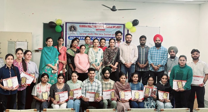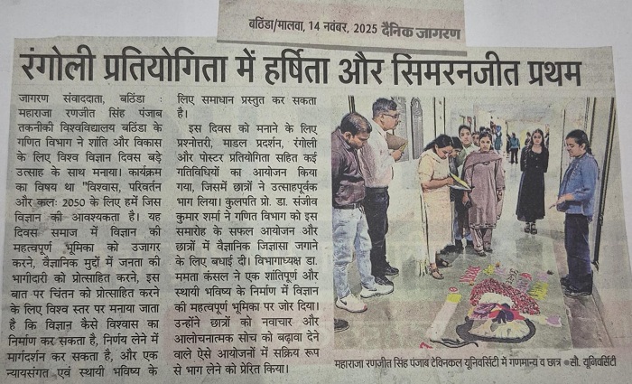 World Science Day Celebrated at MRSPTU….. Bathinda, November 11 The Department of Mathematics, Maharaja Ranjit Singh Punjab Technical University (MRSPTU), Bathinda, celebrated World Science Day for Peace and Development with great enthusiasm. The event was themed “Trust, Transformation and Tomorrow: The Science We Need for 2050.” The day is observed globally to highlight the vital role of science in society, promote public engagement in scientific issues, and encourage reflection on how science can build trust, guide decision-making, and offer solutions for a fair and sustainable future. To mark the occasion, a series of activities including a quiz, model display, rangoli, and poster-making competitions were organized, drawing enthusiastic participation from students. MRSPTU , Vice Chancellor Prof. (Dr.) Sanjeev Kumar Sharma congratulated the Department of Mathematics for successfully organizing the celebration and inspiring scientific curiosity among students. Addressing the gathering, Dr. Mamta Kansal, Head of the Department, emphasized the crucial role of science in shaping a peaceful and sustainable future. She encouraged students to actively participate in such events that foster creativity, innovation, and critical thinking. In the competitions held during the event: Rangoli Competition: Harshita and Simranjeet bagged the first position, while Khushi Rani and Arpan stood second. Poster-Making Competition: Ramandeep Kaur secured the first position and Harpreet Singh came second. Quiz Competition: Diya and Muskan won first prize, followed by Jasneet Kaur and Jasdeep Kaur in second place. Model Display: Sukhmeet claimed the first position, and Ramandeep Kaur secured second. Faculty members of the department distributed prizes to the winners. The event concluded with a vote of thanks delivered by the coordinator, Dr. Mukesh, who appreciated the efforts of the organizing team and congratulated all participants and winners for their enthusiastic involvement. Photo Caption: Glimpses of the World Science Day Celebration at MRSPTU |