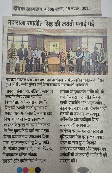 MRSPTU Celebrates 245th Birth Anniversary of Maharaja Ranjit Singh….. Bathinda, November 13 Maharaja Ranjit Singh Punjab Technical University (MRSPTU), Bathinda, commemorated the 245th birth anniversary of Maharaja Ranjit Singh with reverence and enthusiasm. A special lecture was organised in the Vice Chancellor’s Board Room to honour the enduring legacy of the iconic Sikh ruler, fondly remembered as the Sher-e-Punjab. MRSPTU Vice Chancellor, Prof. Sanjeev Kumar Sharma, along with Deans, Directors, Heads of Departments, senior faculty, and staff members, offered floral tributes to the great ruler. In his address, Prof. Sharma reflected on the values, statesmanship, and exemplary leadership of Maharaja Ranjit Singh, who established a strong, secular, and unified Sikh Empire in the early 19th century. Born on November 13, 1780, in Gujranwala (now in Pakistan), the Maharaja remains a towering figure for his administrative acumen, military brilliance, and nation-building vision. The keynote address was delivered by Dr. Kulwinder Kaur, Associate Professor, Government Rajindra College, Bathinda, who presented a detailed historical perspective on the life and legacy of Maharaja Ranjit Singh. She highlighted his contributions to education, social reforms, secular governance, and the consolidation of a powerful empire. Dr. Kaur outlined major historical phases from the turbulent invasions of Nadir Shah and Ahmad Shah Abdali to the rise of Maharaja Ranjit Singh, which reshaped Punjab’s socio-political landscape. She recounted his early military achievements, including the capture of Lahore at age 18 in 1799 and his coronation as Maharaja in 1801. Under his leadership, the empire extended from the Khyber Pass to the Sutlej River and from Kashmir to the Thar Desert. She noted that Maharaja Ranjit Singh fought 49 battles during his 40-year reign—without a single defeat—demonstrating his extraordinary strategic and military insight. Dr. Kaur also discussed the internal betrayals within the Khalsa Army that later enabled British annexation of Punjab after his death in 1839. Adding a personal dimension, she touched on the Maharaja’s marriage to Moran, portraying his multifaceted personality beyond governance and warfare. The event concluded with a vote of thanks by Dr. Gurinder Pal Singh Brar, Registrar, who appreciated the insightful lecture and the enthusiastic participation of faculty and staff. Photo Caption: Glimpses from the 245th Birth Anniversary celebration of Maharaja Ranjit Singh at MRSPTU. |