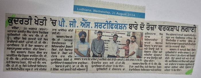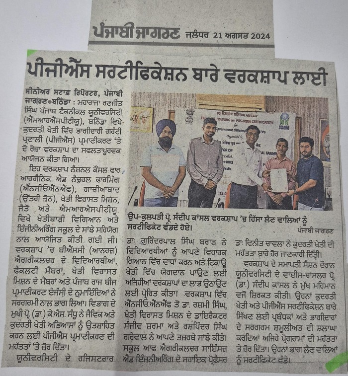 Two-Day Workshop on PGS Certification in Natural Farming Concludes at MRSPTU... Bathinda, August 20: The Two-Day Workshop on Participatory Guarantee System (PGS) Certification in Natural Farming concluded successfully at Maharaja Ranjit Singh Punjab Technical University (MRSPTU), Bathinda. The event was organized collaboratively by the National Council for Organic and Natural Farming (NCONF), Ghaziabad (North Zone), Kheti Virasat Mission, Jaito, and the School of Agriculture Sciences and Engineering at MRSPTU. The workshop saw active participation from B.Sc. (Hons.) Agriculture students, faculty members, Kheti Virasat Mission members, and representatives from the Punjab State Seed Certification Agency. Prof. (Dr.) K. S. Sandhu, Head of the Department, welcomed participants and emphasized the importance of PGS certification in promoting organic and natural farming practices. Dr. Gurinderpal Singh Brar, Registrar of MRSPTU, encouraged students to leverage such workshops to enhance their practical knowledge and contribute to sustainable agriculture. The workshop featured presentations from several experts, including Dr. Rashmi Singh from NCONF, who provided an overview of the PGS certification process. Mr. Sanjeev Sharma, Director of Kheti Virasat Mission, discussed the principles and benefits of natural farming, while Mr. Rashpinder Singh Grewal, also from Kheti Virasat Mission, shared practical tips from his experience as a natural farmer. Dr. Wineet Chawla, Assistant Professor at the School of Agricultural Sciences and Engineering, provided additional insights on the significance of natural farming. The event concluded with a valedictory session where Prof. (Dr.) Sandeep Kansal, Vice-Chancellor of MRSPTU, was the chief guest. He distributed certificates to participants, acknowledging their active involvement and commitment to learning about natural farming and PGS certification. Photo Caption: MRSPTU Vice-Chancellor Prof. Sandeep Kansal distributing certificates to participants at the end of the workshop. |